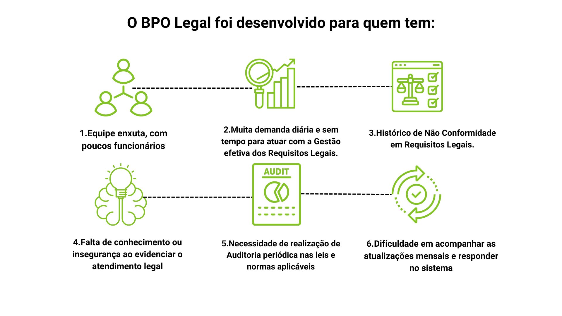 O BPO Legal consiste em manter atualizadas 100% das informações contidas no AmbLegis a cada atualização mensal, respondendo, corrigindo e evidenciando o atendimento de todos os requisitos que o técnico julgar aplicável à atividade do cliente.